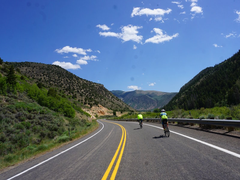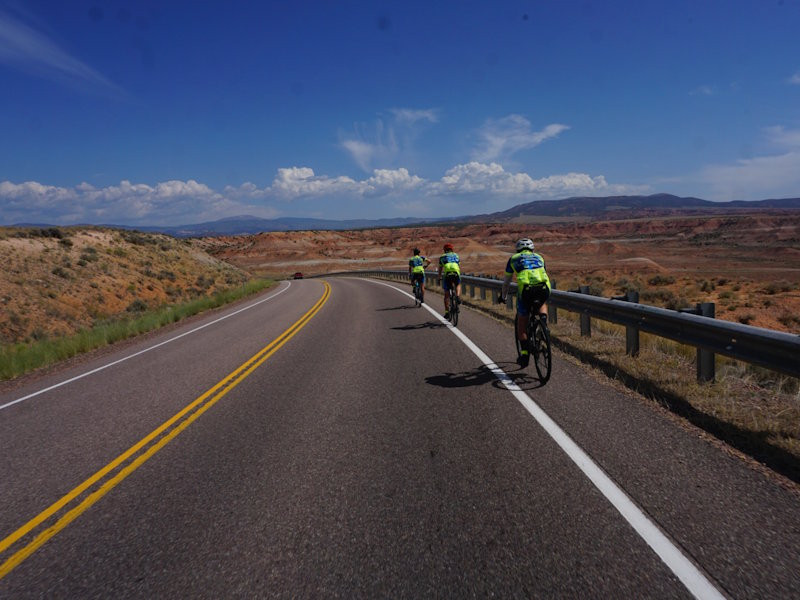 Pretty easy 60-miler today into Vernal. The scenery changed completely from forest to red desert, which was very beautiful. After showers and laundry, the team hiked to a cliff jumping spot in Red Fleet State Park – the jump was almost 50 feet!. The area is known for its fossils, and we saw some fossilized dinosaur footprints on our hike. We're staying at the Vernal Elk Lodge tonight. Big day tomorrow!